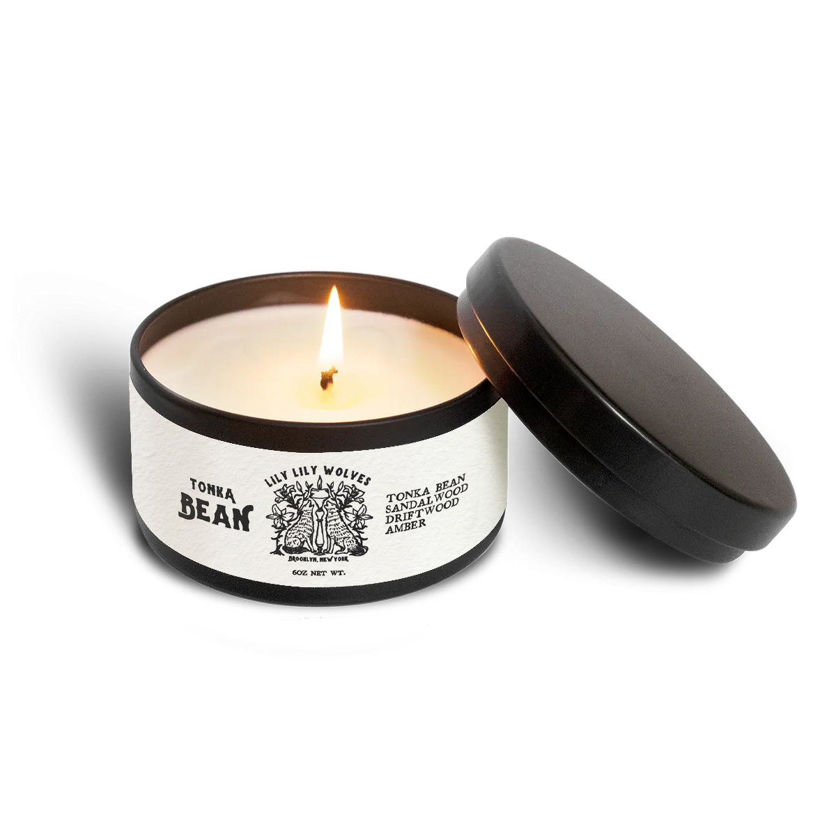 We use a heavier duty metal tin for our candles that can be reused to store small items or treats for your pups!